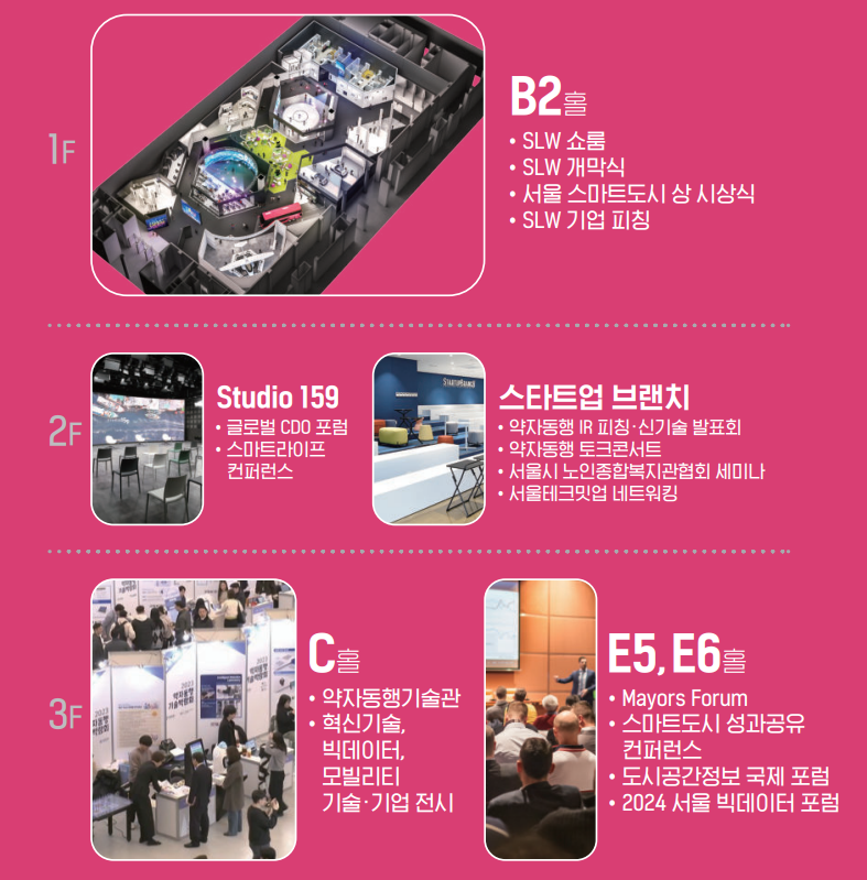 특히 '플로어 투어'와 'Seoul City Tech Tour'는 전시장에서 진행되는 기술 체험 투어로, 혁신적인 기술을 직접 보고 체험할 수 있는 시간이 될 것입니다.