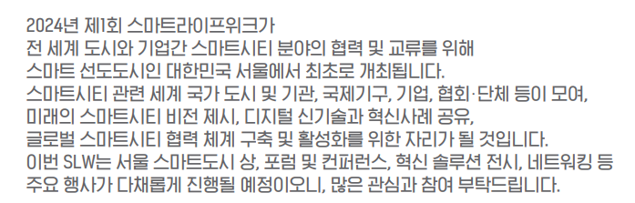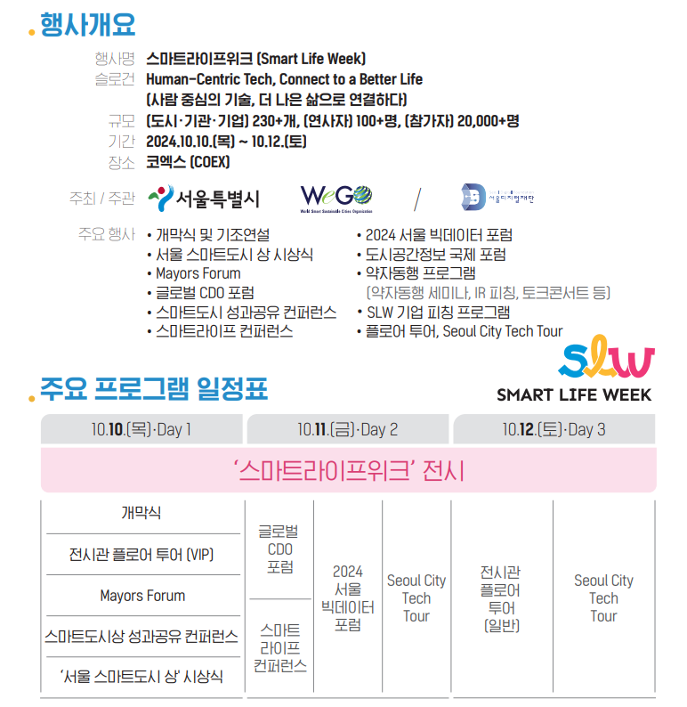 이번 **스마트라이프위크(SLW)**는 단순한 전시회가 아닌, 미래 도시의 비전과 기술을 공유하고 글로벌 스마트시티 협력 체계를 구축할 수 있는 중요한 행사입니다. 기술과 도시의 미래에 관심 있는 분들이라면 꼭 참여해보시길 추천합니다.