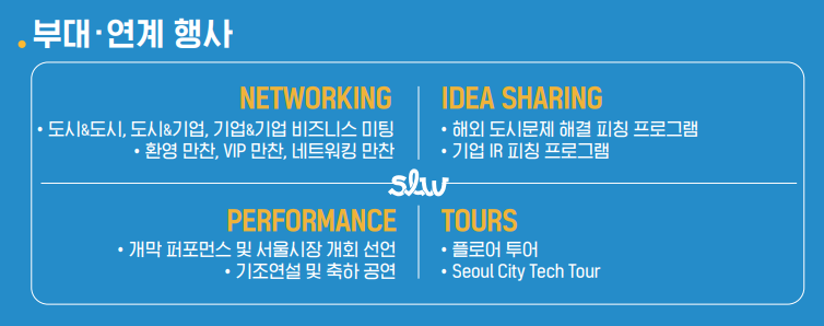 SLW 2024는 네트워킹과 협력의 기회를 제공하는 여러 부대 행사도 진행합니다. 행사 참여자들은 도시와 도시, 기업과 기업 간의 비즈니스 미팅을 통해 협력을 모색하고, 다양한 분야의 전문가들과 직접 소통할 수 있는 기회를 가질 수 있습니다.