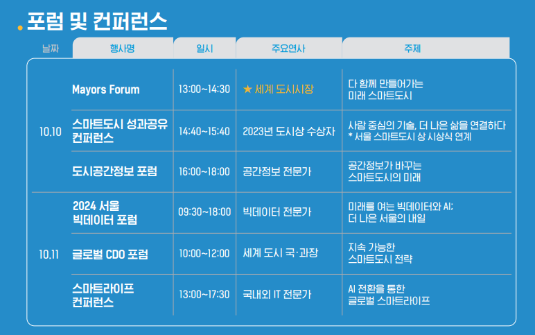 - 서울 스마트도시 상 시상식: 세계의 선도적인 스마트도시를 선정하고 그들의 노력을 기리기 위한 상 시상식이 열립니다.